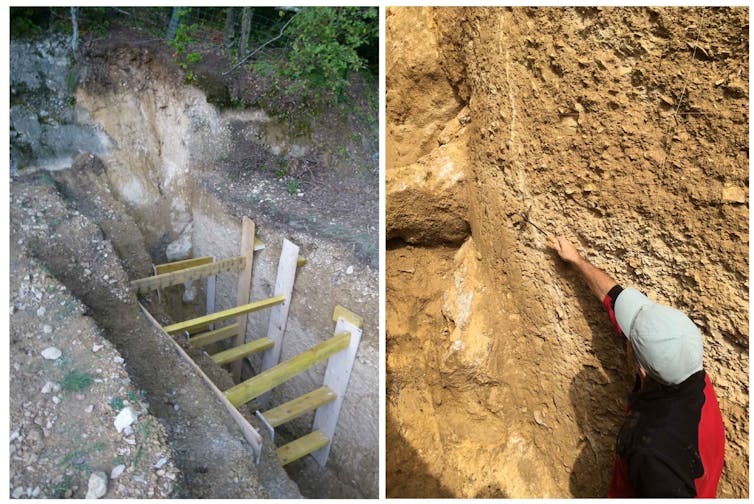 Les paléosismologues décryptent les tremblements de terre passés. Dans ce cas, ils étudient la faille de la Rouvière et les autres failles qui constituent cette partie du réseau de failles des Cévennes dans le but de déterminer si elles avaient déjà produit des ruptures de surface au cours des 2 derniers millions d’années. Ils analysent si des déformations associées à des séismes (par exemple des fissures, ruptures avec déplacements, plis, basculements) affectent les couches sédimentaires les plus récentes (comme les éboulis de pentes, alluvions fluviatiles, sables) au niveau de tranchées qu’ils creusent au travers des failles.